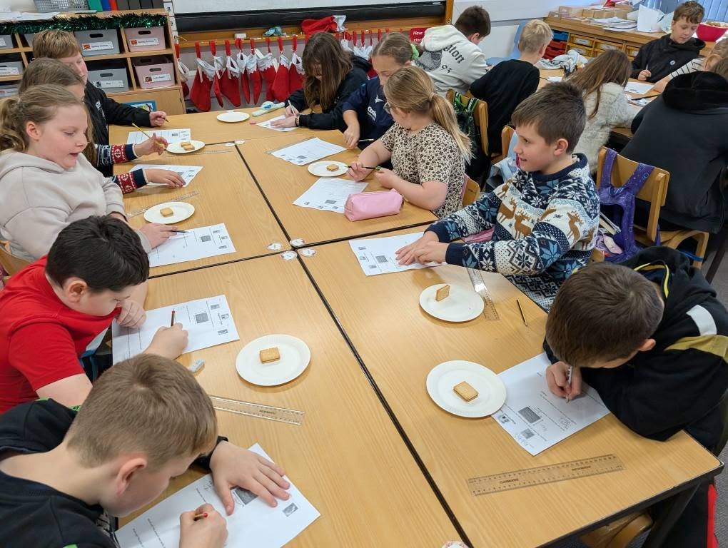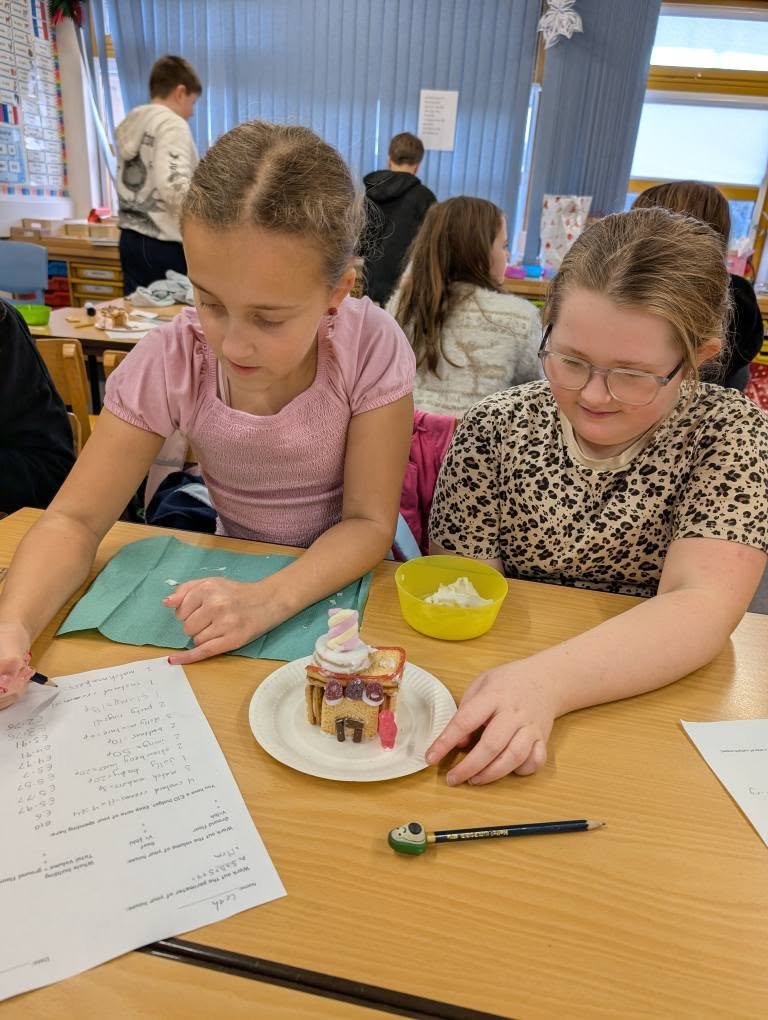 Before the construction began, pupils applied a range of mathematical skills including measuring and rounding to the nearest centimetre, finding the area of each biscuit, calculating the total area of the walls (linked to real-life examples such as painting a house), exploring perimeter, and calculating the volume of their houses β a strong link to current classroom learning.