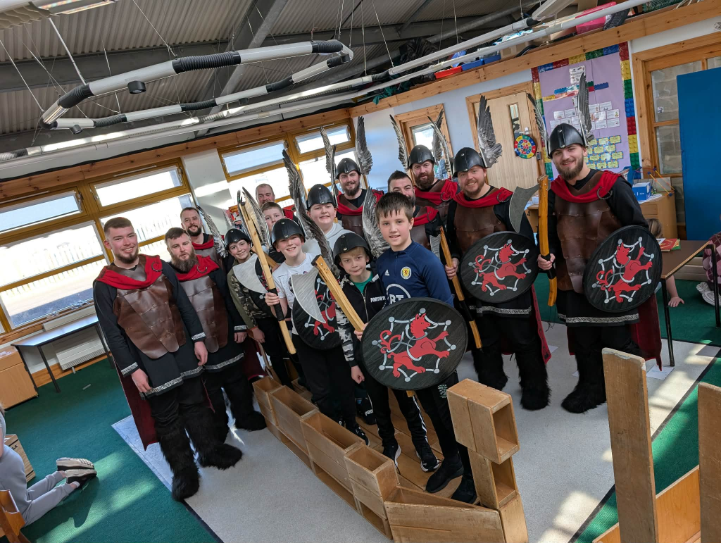 They performed the Up Helly Aa Song and their squad song, Walk of Life, before heading over to the Primary department to spend time with the bairns. The squad joined in with dancing, a game of What’s the Time, Mr Wolf?, construction challenges, and plenty of photo opportunities. They also helped carry out some World Book Day presentations, which the pupils really enjoyed.