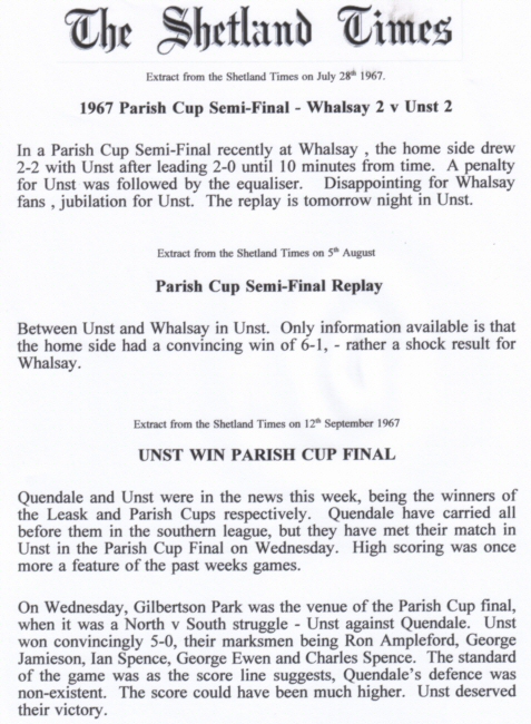Unst F.C. won the Parish Cup in 1964, 1965, 1967 and 2000.